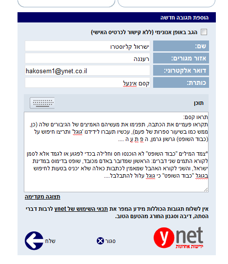 החלטתי לעשות מעשה ולפרסם תגובה, מתונה וריאלית עם זהותי המלאה, דרך ממשק הניהול של ווינט. משום מה רגישות העורכים גבוהה מדי כנראה והם סרבו לפרסמה, בימים אלו כולם מתנהגים בנימוס אל מול שלטון החוק. אי-נעל התקשורת.